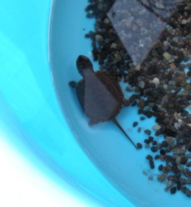 我が家の子亀たち 家族 2009.06.18 5月の初め、近所の方から子亀をわけてもらいました。 初めは1匹でしたが、数日後にまた1匹、2匹といただき 今では4匹になりました。 毎日、娘二人と主人が水かえや餌やりをしてくれています。 たらいの中に小さな砂利を入れて丘をつくってあります。 ゆっくり歩くイメージですが、朝はなかなか活動的です。