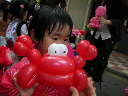 燕夏祭り 家族 2008.07.22 切り文字屋オッケイの イメージキャラクターの カニを バルーンアートの お姉さんに 作っていただきました。 子供以上に 母の私が喜んでしまいました。 いとこ4才、かりん3才、くるみ5才の浴衣3人娘でした。 あまりに 暑い日だったので たらいに水を入れて カニさんの小プールを 作りました。