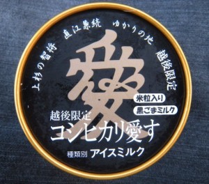 「愛」の愛す アイス 家族 2009.09.26 先日、道の駅 久賀美ふれあいセンター隣りの建物で お昼ご飯を食べた時に見つけたアイスです。 中身はごまアイスにさらにごまがかかっていて 私のお好みの味でとっても美味しかったです。 皆様も新潟に来た際は、是非 越後限定 コシヒカリ愛すを食べてみてください。